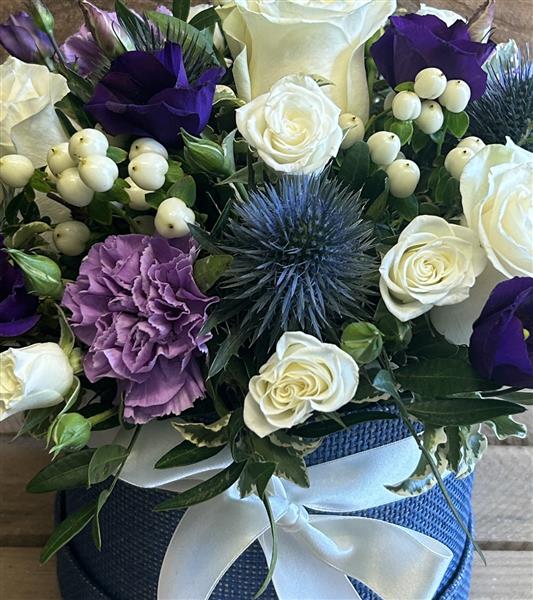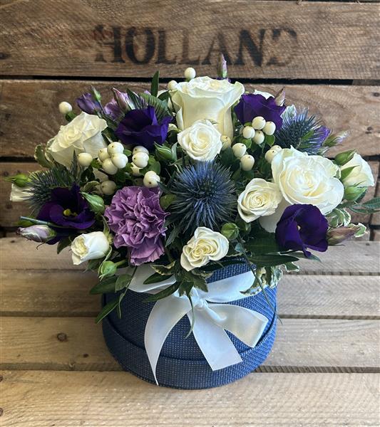 Purple, cream and white seasonal flowers and greenery arranged in a hatbox.