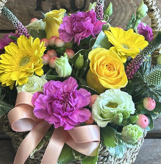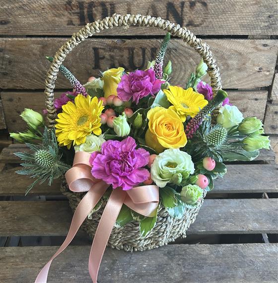 A beautiful seagrass basket filled with lemon, bright pink and peach seasonal flowers and foliage.