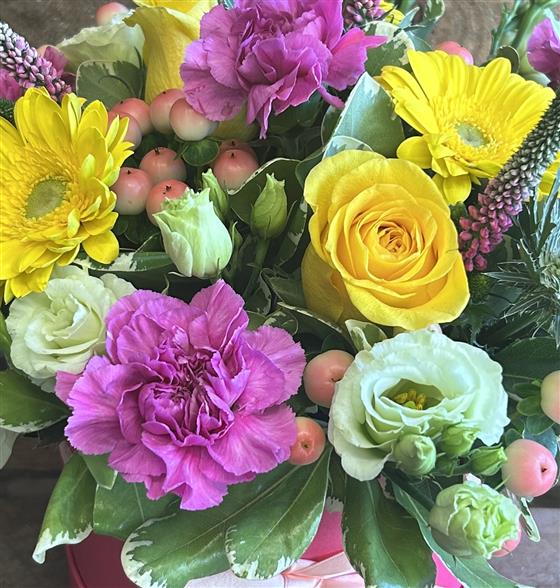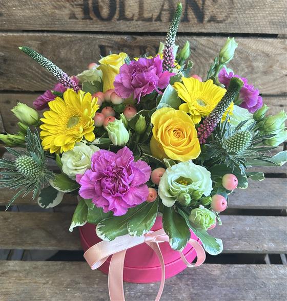 Bright cerise hat box arranged with lemon, vibrant pink and peach seasonal flowers. Finished with a coordinating bow.