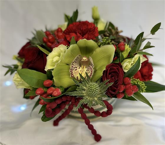 Basket arrangement of seasonal flowers in traditional festive shades of red, green and gold. Finished with a coordinating bow.
