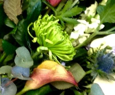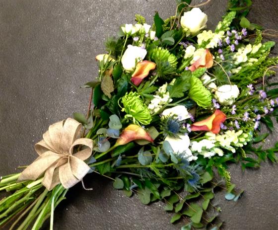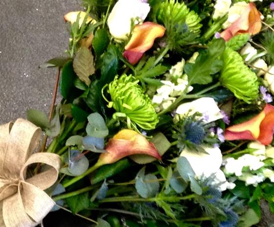 Funeral sheaf in orange, lime and white seasonal flowers including blue thistle for a Scottish touch.