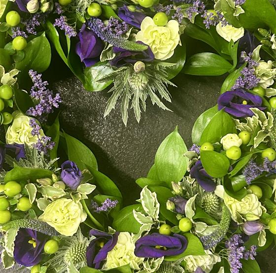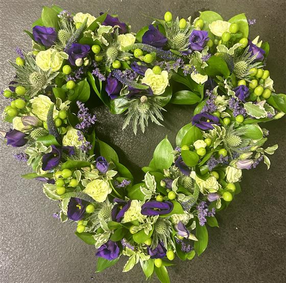Loose open heart in purple and green seasonal flowers.