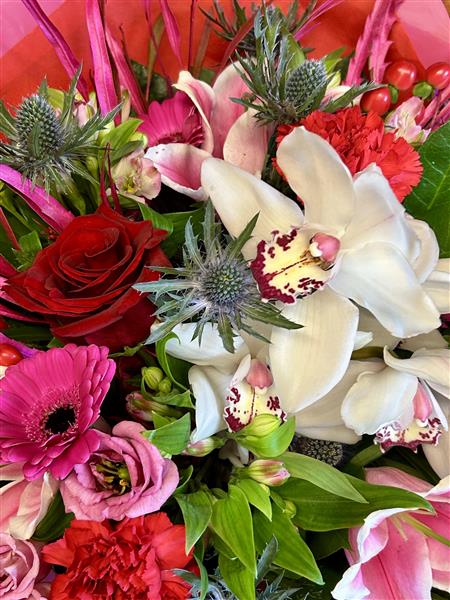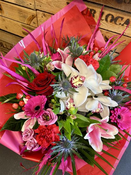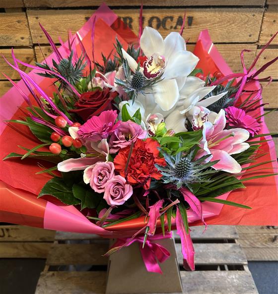 Luxury hand tied bouquet of vibrant red and cerise seasonal flowers, mixed foliage, a single red rose and a beautiful orchid. Gift wrapped with coordinating cellophane and a satin bow in a vase.